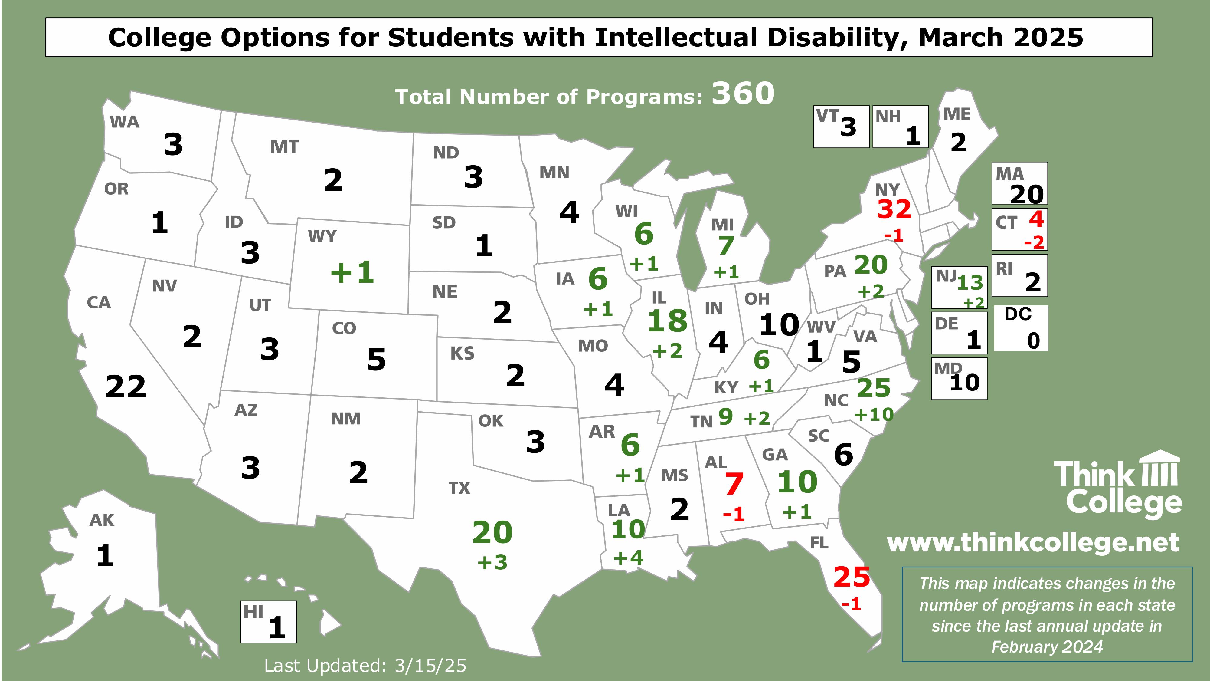After the update in 2024, there were 333 programs in our directory and we now are sharing information on 360 programs. New programs had been added to the college search directory throughout the year, while five programs were removed. When all was said and done, there was a net gain of 27 programs available to students with intellectual disability.