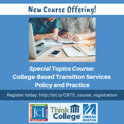 Think College and the Transition Leadership Program at the Institute for Community Inclusion at the University of Massachusetts Boston are excited to announce a new special topics course for transition specialists, college program coordinators, secondary education teachers, secondary special education administrators, and doctoral and Master's students. This 3-credit online course will address topics such as: