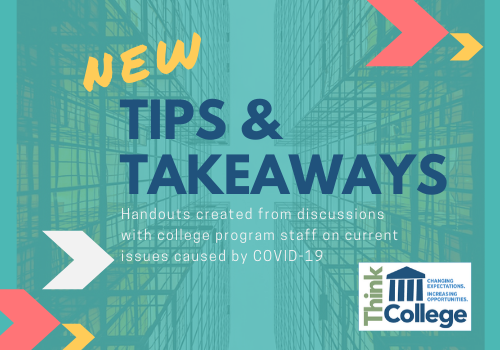 In March 2020, COVID-19 quickly shut down much of the United States, forcing schools to send staff and students home and begin a new task for most: distance learning. For college students with intellectual disability, this sudden shift posed unique challenges—and for the staff who support them, as well. Staff at Think College quickly realized it could be helpful to give the college program staff a forum to share information, discuss critical topics, and just support one another, so we started hosting weekly meetings. We talked about supporting students’ social and emotional needs, how to continue access to core academic content remotely, how to provide employment supports online, communicating with families, and more. Program staff from around the country were quick to share tips and resources that were working for them, and now we are sharing them with you. These tip sheets were created from the meeting recordings and there are numerous links to external resources that might be helpful to you; they are linked in this article and can be found in the Think College resource library.