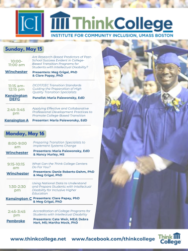 Don’t miss Think College team members at the Division on Career Development and Transition (DCDT) International 2022 Conference in Myrtle Beach, SC from May 15-17! If you are at the DCDT conference, stop by our sessions or our table in the exhibit hall to say hello!