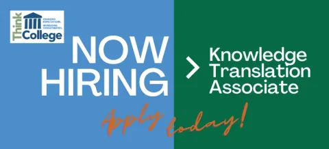 Think College at the Institute for Community Inclusion, UMass Boston is hiring for the Knowledge Translation & Dissemination team! The Knowledge Translation Associates (KTA) will connect with partners, educators, families, and others around the country to disseminate information about college options for students with intellectual disability using a variety of channels, including social media, publications, video, websites, emails, newsletters, and more.