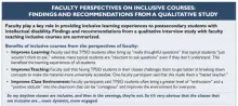 This presentation highlights findings from a qualitative study of faculty perspectives on inclusive courses in higher education on topics such as recruitment, orientation, faculty support, and stud